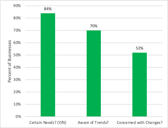 The first important factor that enables SMEs to adopt BA is their awareness of BA tools and usefulness, and any emerging trends or changes in their specific industry area. About 70% of participating businesses say they have a general understanding of BA and can recognize trends of data usage in their sector (Figure 1). In addition, 84% of enterprises in our study acknowledge that there are certain needs in their businesses that the adoption of data analytics can fulfill. Roughly half of the businesses that participated in this research expressed concern about their ability to keep up with the rapidly evolving landscape of BA. Among those who are worried about staying current with analytics, many acknowledge that they “may be missing some opportunities.”