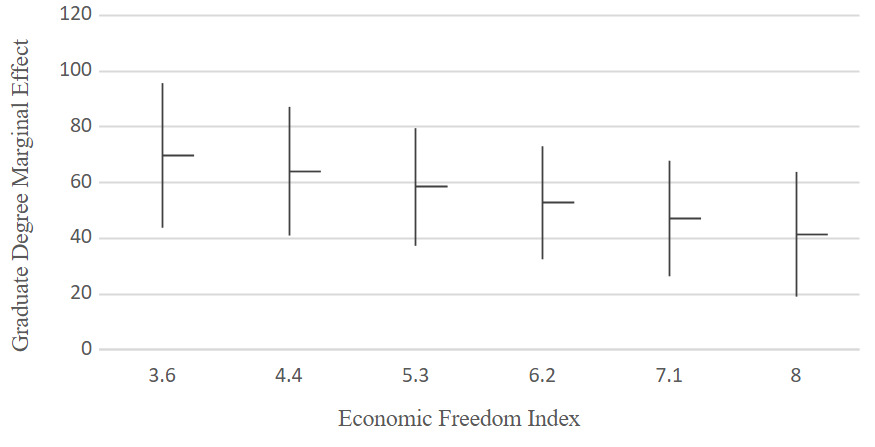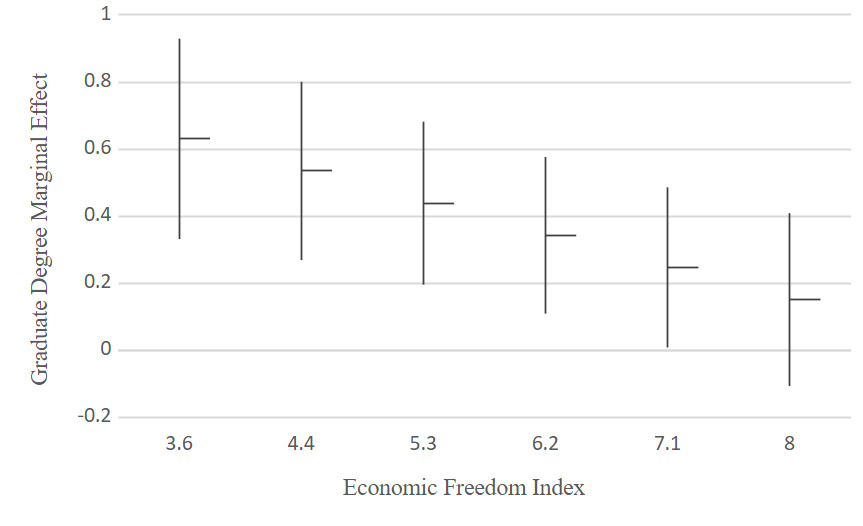 When we use the number of new business formations as the independent variable (Figure 3), the pattern remains similar. At low levels of economic freedom, graduate school education has a positive and significant effect. This effect decreases as the level of economic freedom rises and becomes insignificant at the highest levels of economic freedom (above 7).